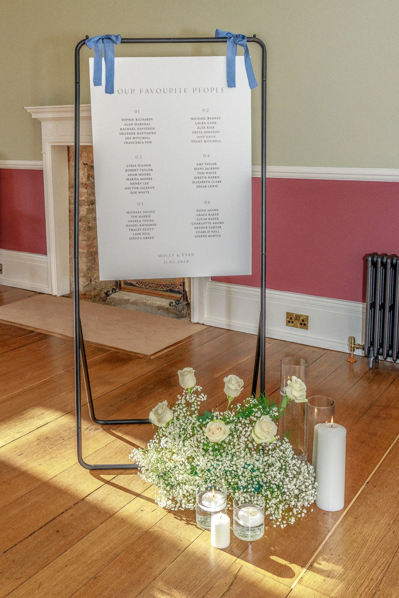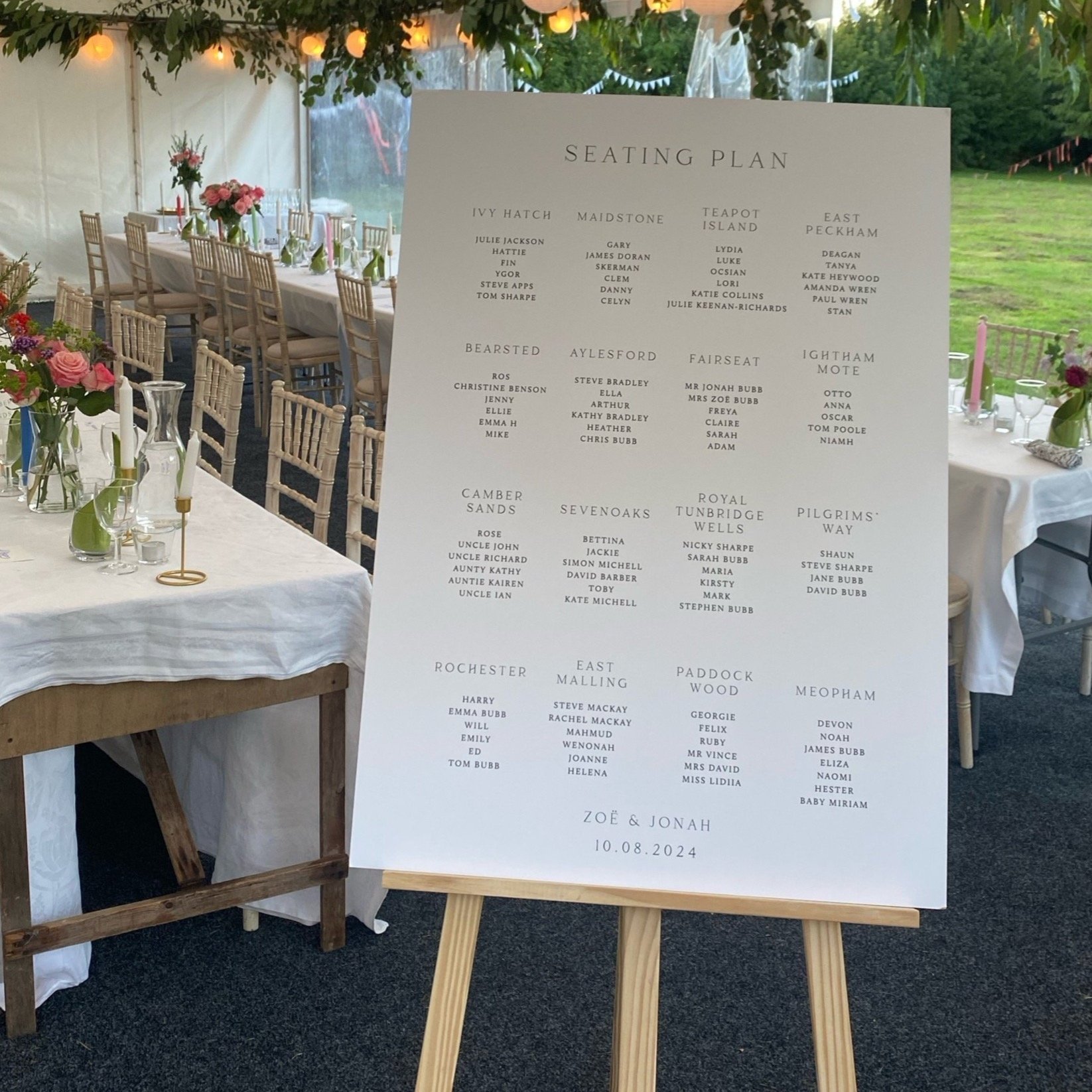 Instead of having your sign on an easel, why not hang it with some gorgeous ribbon? A lovely alternative to the standard easel setup. This seating plan is printed on 3mm recycled board so it is lightweight and sustainable.